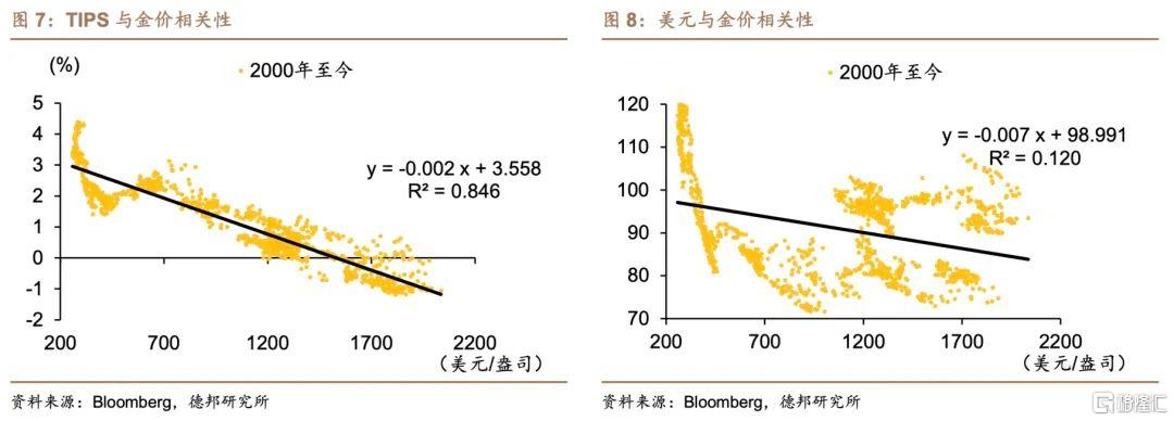 黄金价格经常被认为和美元指数呈现明显的负相关,看美元做黄金成为了部分投资者“共识的误区”。从历史上来看,美元指数与金价确实存在部分时间段内趋势上的相关,但实际上我们如果对比美国实际利率(TIPS)和金价,会发现其呈现更完美的趋势贴合。从回归的结果也可以看出,趋势线的解释力度较强。