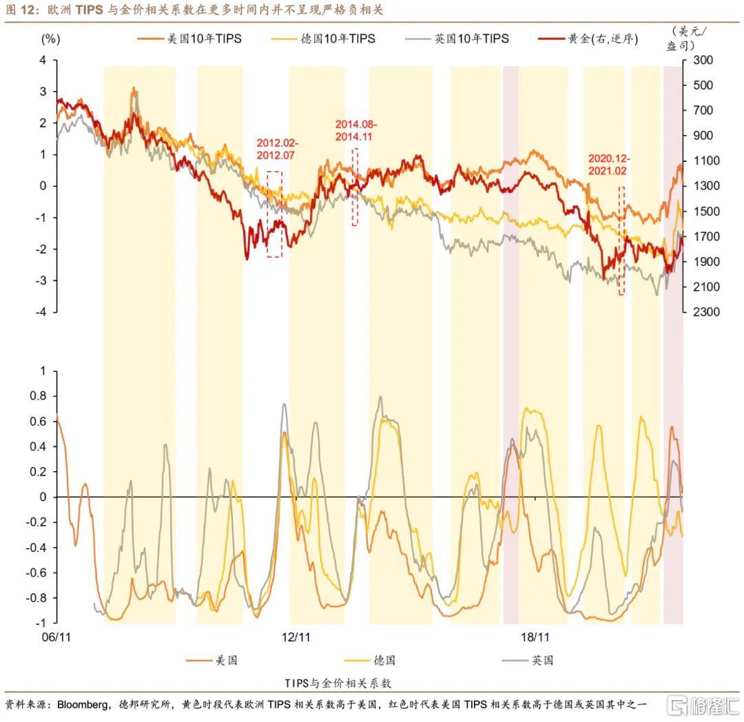 我们继续拆解不同时期美国TIPS与金价变动的同步性,我们发现其滚动相关系数为正的时间区间并不如美国10年TIPS和金价变化趋势一致。除了在前文中所述的流动性冲击对所有资产的影响导致的非理性变化外,我们也发现自2021年以来,美国TIPS因为被美联储过多持有定价出现扭曲的情况,因此,我们继续拆解全球其他地区的实际利率与金价变化的相关性。我们观察英国和德国的TIPS发现,在大部分时间内,欧洲的TIPS与美国的变化较为一致,但在部分金价和美国TIPS呈现同向或者无关变化时,欧洲TIPS的变动可以部分解释金价的变化原因。我们用英国、德国和美国的TIPS进行相关性拟合,我们发现,在极端负相关的区间,即相关系数接近-1的时候,美国TIPS仍然是与金价走势的相关性最高的。而在其他的时间段,英国和德国TIPS经常呈现正相关,甚至是较高程度的正相关,我们认为可能跟欧洲债券的流动性存在一定的关系。但在部分金价与美国TIPS呈现同向变化的过程中,德国TIPS和英国TIPS与金价呈现明显负相关,在相关系数均接近-1的情况下,不同国家TIPS的变化影响对金价作用的带动不同。如2012年2月至2012年7月和2020年12月至2021年2月,在美国和英国TIPS均下行的过程中,德国TIPS上行引导金价下跌;2014年8月至2014年11月,金价跟随英国TIPS变动。我们认为,每一次不同国家TIPS的调整对金价影响的权重均有不同,因此,金价不仅仅是受到美国TIPS的影响,而是受到全球实际利率的共同影响。由此我们也可以总结出驱动美元指数变化和金价变化的共同因素的不同作用方向,即金融部门主导的美元指数变化由欧美实际利率之差决定,而黄金价格变化由欧美实际利率之和决定。