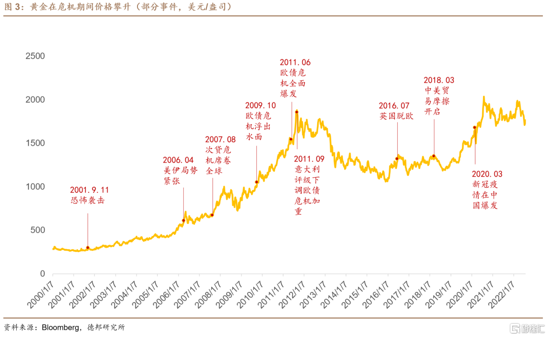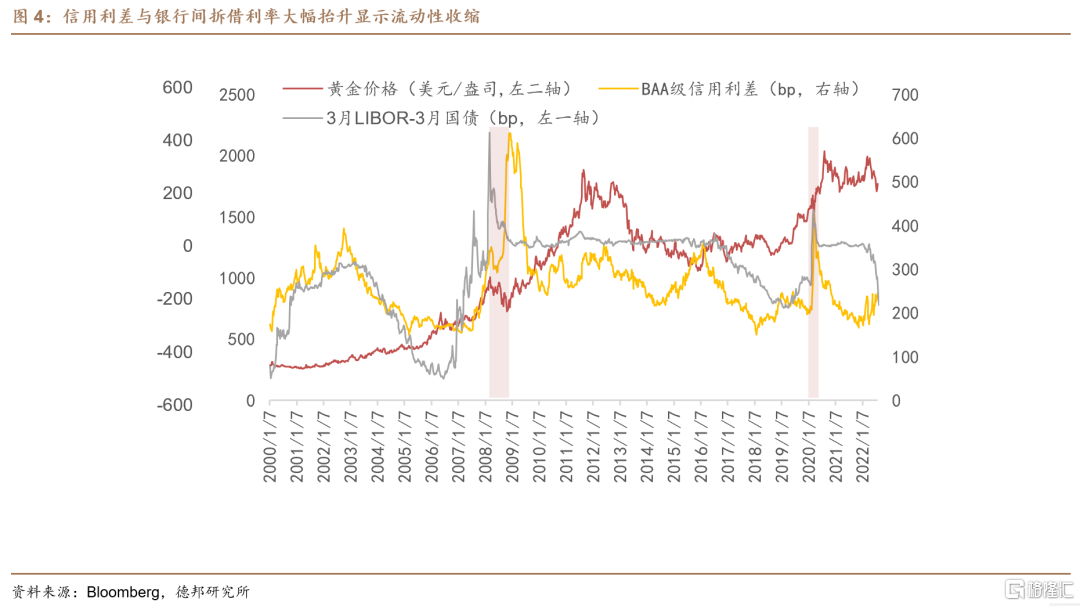 作为避险资产,黄金的独特属性导致其在危机期间往往成为被追捧的对象出现价格上行,地缘政治风险、主权和货币信用危机发生期间,投资黄金往往都能获得较好的收益。但在历史几次著名的危机初期,金价却出现了罕见的下跌。2008 年8月,雷曼兄弟破产引发全球恐慌,金融机构出现信用危机,黄金的避险属性本该引导金价上行,但10 月中旬金价下跌幅度已超过 20%。金融机构信用危机导致机构赎回压力大增,流动性快速收缩,黄金的避险需求让位于流动性需求迫使投资者出售黄金以换取流动性,引发金价下跌。2020年全球疫情爆发初期,黄金再次经历了同样的流动性挤兑,各类资产价格同时快速下跌,在流动性危机缓解后,各类资产的价格才开始逐渐分化。