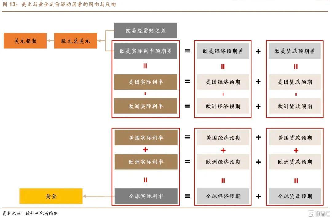 黄金价格经常被认为和美元指数有负相关关系,看美元做黄金成为了部分投资者“共识的误区”。从表观数据上看,在驱动美元指数变化的因素当中,确实有很大一部分与驱动TIPS变化的因素有交叉。驱动美元指数变化和金价变化的共同因素的不同作用方向,即金融部门主导的美元指数变化由欧美实际利率之差决定,而黄金价格变化由欧美实际利率之和决定。