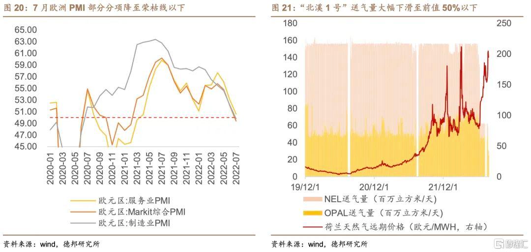 6月初,欧盟委员会公布第六轮对俄罗斯的制裁措施,包括部分石油禁运,制裁俄罗斯油轮、银行和媒体等。欧盟将在6个月内停止购买俄罗斯海运原油,这占欧盟进口俄原油的三分之二,并在8个月内停止购买俄石油产品。与此同时,尽管7月21日“北溪1号”检修后恢复供气减缓了天然气断供的担忧,但恢复供气后NEL和OPAL两大天然气公司的送气量约为正常时期的20%,即便其他公司均开始供气,流量水平的下降可能也已经无法满足欧洲冬天的采暖需求。俄乌局势和欧洲的制裁暂未出现转圜,政治立场的因素导致的欧洲的能源供给短期内将呈现明显的短缺局势,对俄罗斯的制裁导致缺气减量的压力剧增,欧洲最快在三季度供暖季来临之时可能面临严重的供暖危机。