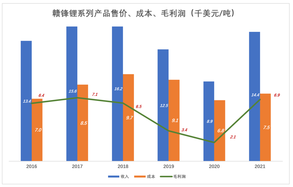 以2017年为例,天齐每吨锂矿石毛利润为465美元,赣锋每吨产品毛利润7100美元,毛利润率45.4%。再看2021年,赣锋锂产品销售均价折合1.44万美元、毛利润6880美元、毛利润率47.8%。