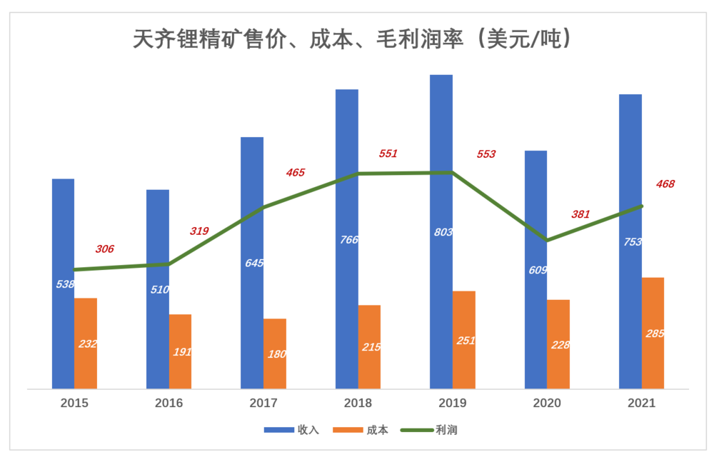 2021年,锂精矿销售价格同比增长23.7%、至753美元/吨(低于2018年、2019年),而采购价格增长25.1%、创纪录地达到285美元/吨;毛利润468美元/吨、利润率62.1%(较2017年峰值低10个百分点)。