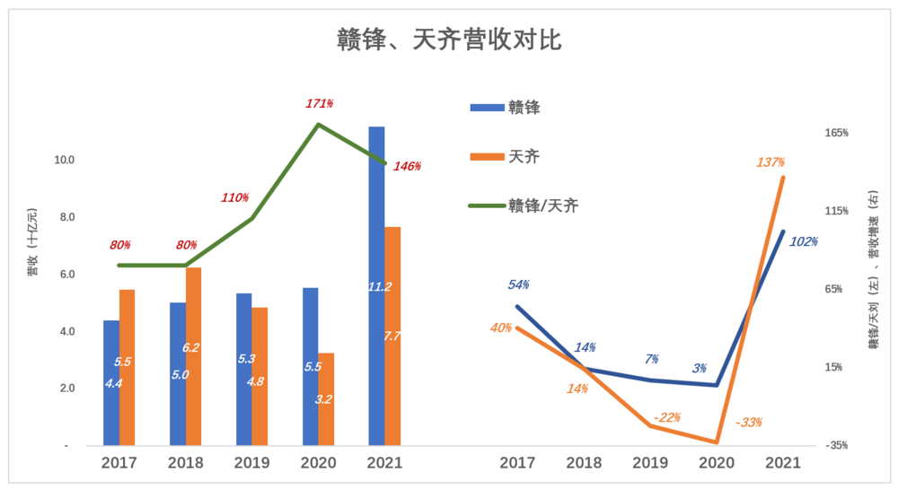 2021年,天齐增速比赣锋高35个百分点,但仍大幅落后。