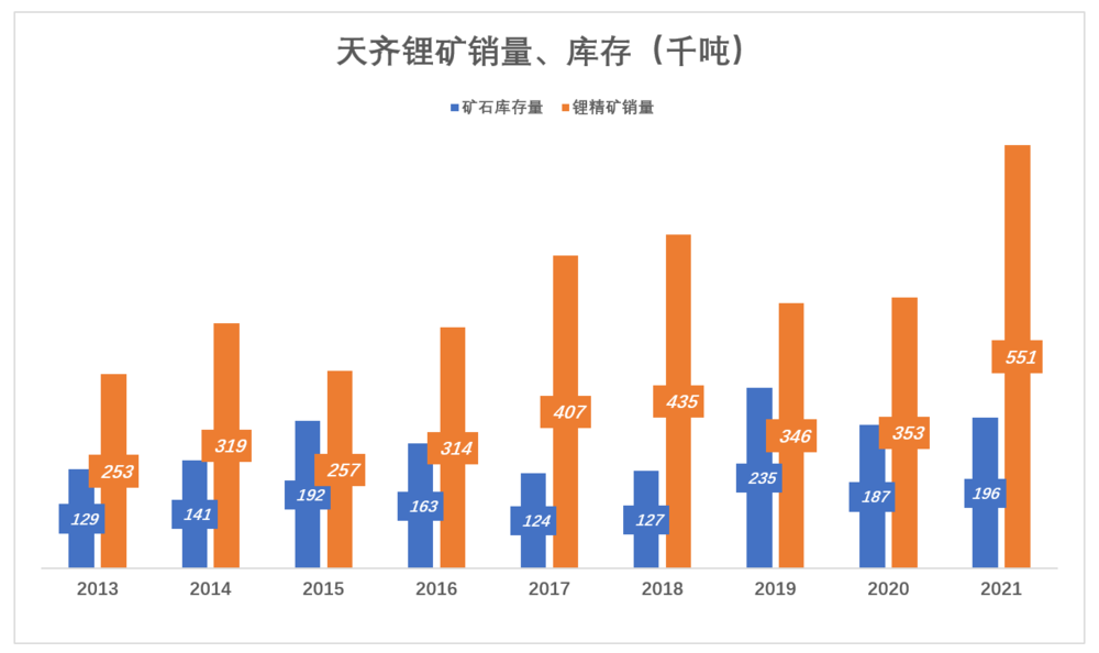 天齐从泰利森获得的锂矿石,大部分被直接出售,少部分用于制造锂化合物(碳酸锂、氢氧化锂)。2021年,卖矿石收入约占营收的35%。