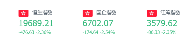 港股早盘走低后全天弱势震荡,恒生指数收盘跌2.36%报19689.21点,恒生科技指数跌3.01%报4194.04点,恒生国企指数跌2.54%报6702.07点。大市成交1180.89亿港元。各板块全线下跌;科技龙头午后有所回暖。
