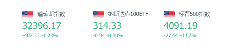 美国三大股指全线收跌,道指跌1.23%报32396.17点,标普500指数跌0.67%报4091.19点,纳指跌0.16%报12348.76点;万得美国TAMAMA科技指数跌0.52%,中概股逆势大涨。
