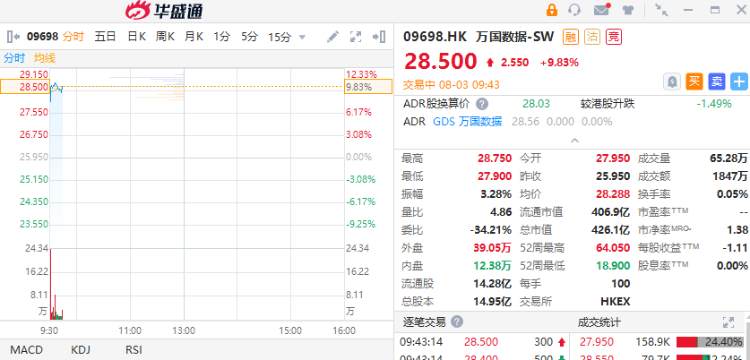 华盛资讯8月3日消息,回港中概股开盘走高,截至发稿,万国数据涨逾9%,报28.5港元。