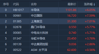 华盛资讯8月3日消息,午后港股半导体板块挺起“脊梁”,中芯国际现涨7.59%,上海复旦涨7.01%,晶门半导体涨5.77%,华虹半导体涨3.76%。