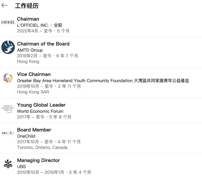 更有意思的是,因为他之前在瑞银兼职过家族办公室有关的业务,他和香港本地的一些家族办公室有联系,随后在他的职业生涯中,可见一些本地家族的联系。