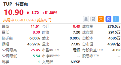 特百惠 $TUP 盘初涨逾50%,公司此前公布每股收益为0.41美元,高于预期的0.25美元,超出预期64.0%。