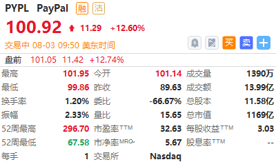 Paypal $PYPL 盘初涨超12%,该公司Q2营收68.1亿美元,上年同期为62.38亿美元,同比增长9%;净亏损3.41亿美元,预期净利润6.29亿美元。