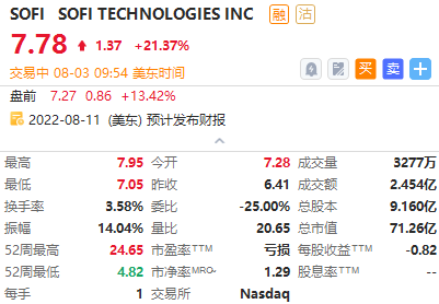 金融服务公司SoFi Technologies $SOFI 盘初涨超21%,第二季度调整后净收入为3.5609亿美元,同比增长50%。