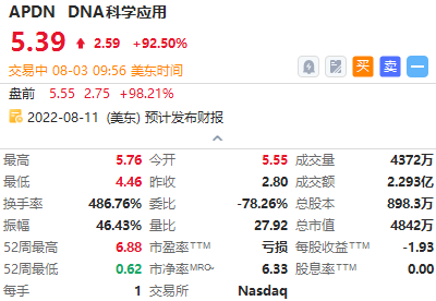 猴痘概念股DNA科学应用 $APDN 盘初涨超92%,随着该公司猴痘PCR检测试剂盒离更大范围的测试又更近了一步、引起了市场热烈的反应,投资者们纷纷抢购其股票。