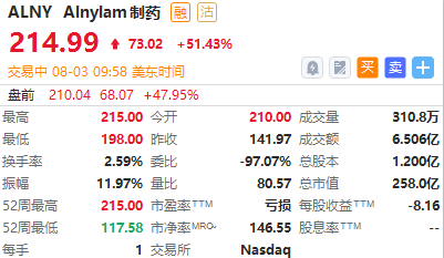 Alnylam 制药 $ALNY 盘初涨超50%,旗下药物Onpattro治疗一种罕见的心脏病,该公司表示,备受期待的后期试验得出了积极的结果。