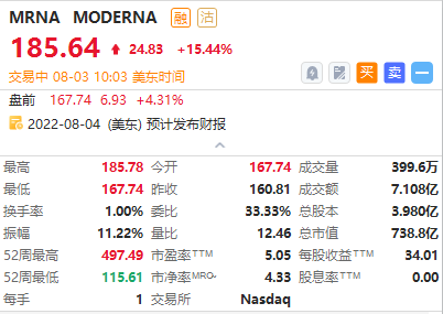 Moderna $MRNA 盘初涨超15%,Q2营收47.5亿美元,预期40.65亿美元,净利润22亿美元,预期19.29亿美元,宣布新的30亿美元股份回购计划。