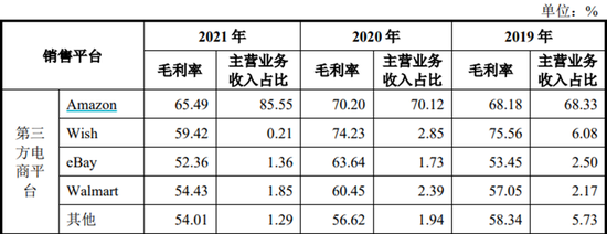 FBA仓报废金额较高,与赛维时代对亚马逊的深度依赖相关。2019-2021年,赛维时代在亚马逊的销售额分别为19.7亿元、36.8亿元和47.6亿元,占主营收入之比从68%升至86%,依赖程度在加深(表1)。