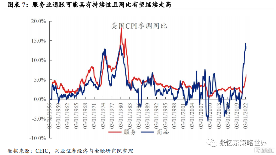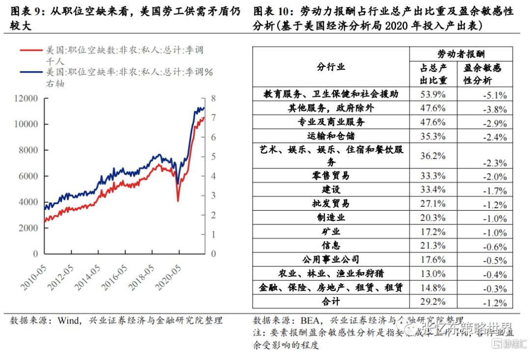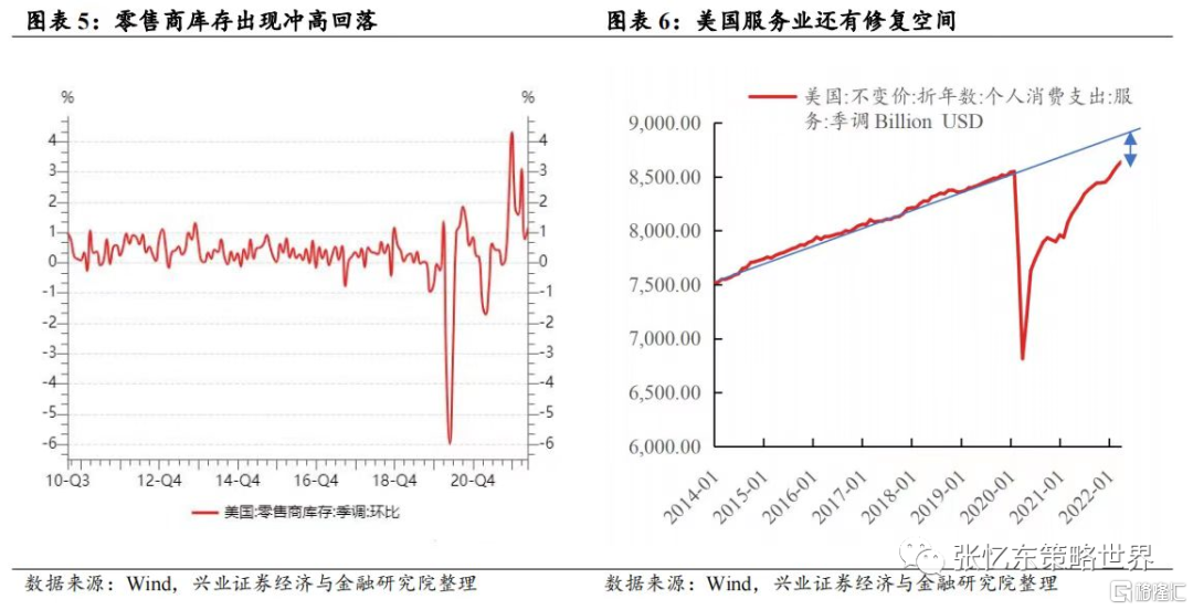 基于这种特殊性,美国经济仍在滞胀期。商品消费方面:1)商品消费或有因为财政脉冲高基数因素,随着财政退潮回落;2)今年以来的零售商持续累库,显示疫前疫后商品需求存在结构性变化,需要一段时间去库存。服务业方面,作为美国经济的压舱石,依然处于修复之中,也指向劳动力市场的强劲、服务业通胀可能具有持续性且同比有望继续走高。