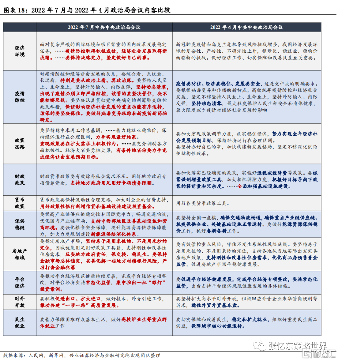 7月政治局会议对宏观政策的部署保持稳健,或显示短期大力度的增量政策并不急于出台。相较于4月29日政治局会议强调“努力实现全年经济社会发展预期目标”,本次会议强调“力争实现最好结果”,要求主动作为“经济大省要勇挑大梁,有条件的省份要力争完成经济社会发展预期目标”。财政政策方面强调“用好地方政府专项债券资金,支持地方政府用足用好专项债务限额”;货币政策方面强调“要保持流动性合理充裕,加大对企业的信贷支持”。房地产“坚持房子是用来住的、不是用来炒的定位,因城施策用足用好政策工具箱,支持刚性和改善性住房需求,压实地方政府责任,保交楼、稳民生,要保持金融市场总体稳定”。