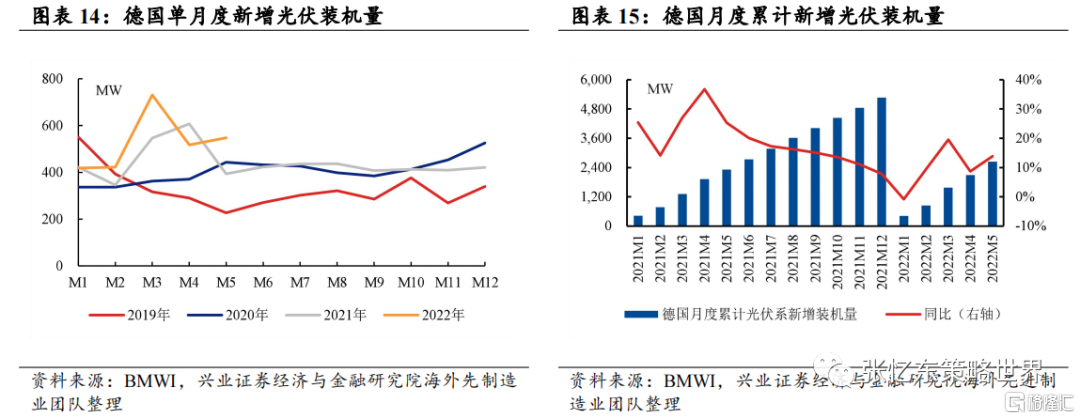欧洲在能源危机的困局下加快新能源投资。以德国为代表的欧盟国家光伏装机需求强劲。据BMWI,截至2022年5月末,德国累计光伏装机量61.66GW,同比+10.0%,较上年末+3.7%;2022年1-5月新增装机2,638MW,同比+13.8%;其中5月单月新增装机548MW,同比+39.0%。