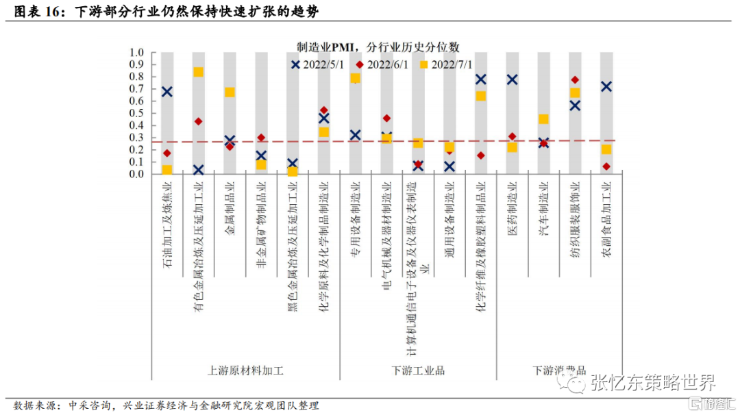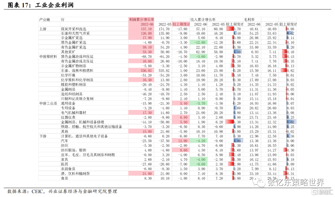 制造业持续保持高景气。1)专用设备、汽车、铁路船舶航空航天设备等行业PMI高于52.0%,也得益于上游大宗价格快速下行对成本压力的缓解。2)6月工业企业利润累计同比增速较5月显著提升的是中游设备以及下游消费中的汽车、纺织,电气设备保持了高增速。