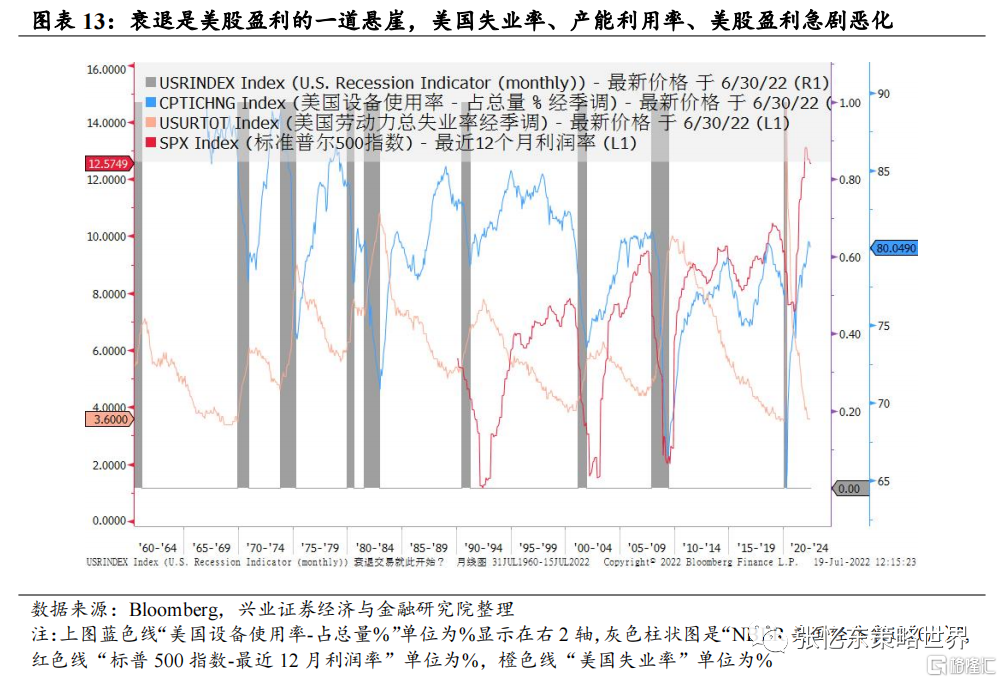 ——其次,如果衰退,还要警惕美股的“盈利悬崖”。以史为鉴,NBER宣布的美国衰退期,美股遭遇“盈利悬崖”——美国失业率、产能利用率、美股利润率急剧恶化。(参20220726《美股何时见底?警惕经济衰退和盈利悬崖》)