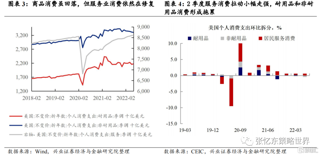 但是,“技术性衰退”指向本轮美国经济的特殊性 ——疫情期间有财政脉冲,疫情之后消散;疫情期间以及复苏阶段早期,商品消费拉动为主,疫情之后是服务业修复接力。这种特殊性使得虽然“技术性衰退”,但是结构分化很明显:美国2季度消费来看,耐用品和非耐用品拉动均转负、但是服务消费继续走强——二季度耐用品消费环比拉动从0.2%下降至-0.1%,非耐用品环比拖累则从-0.2%进一步扩大至-0.3%,服务消费环比拉动从0.4%继续上升至0.6%。