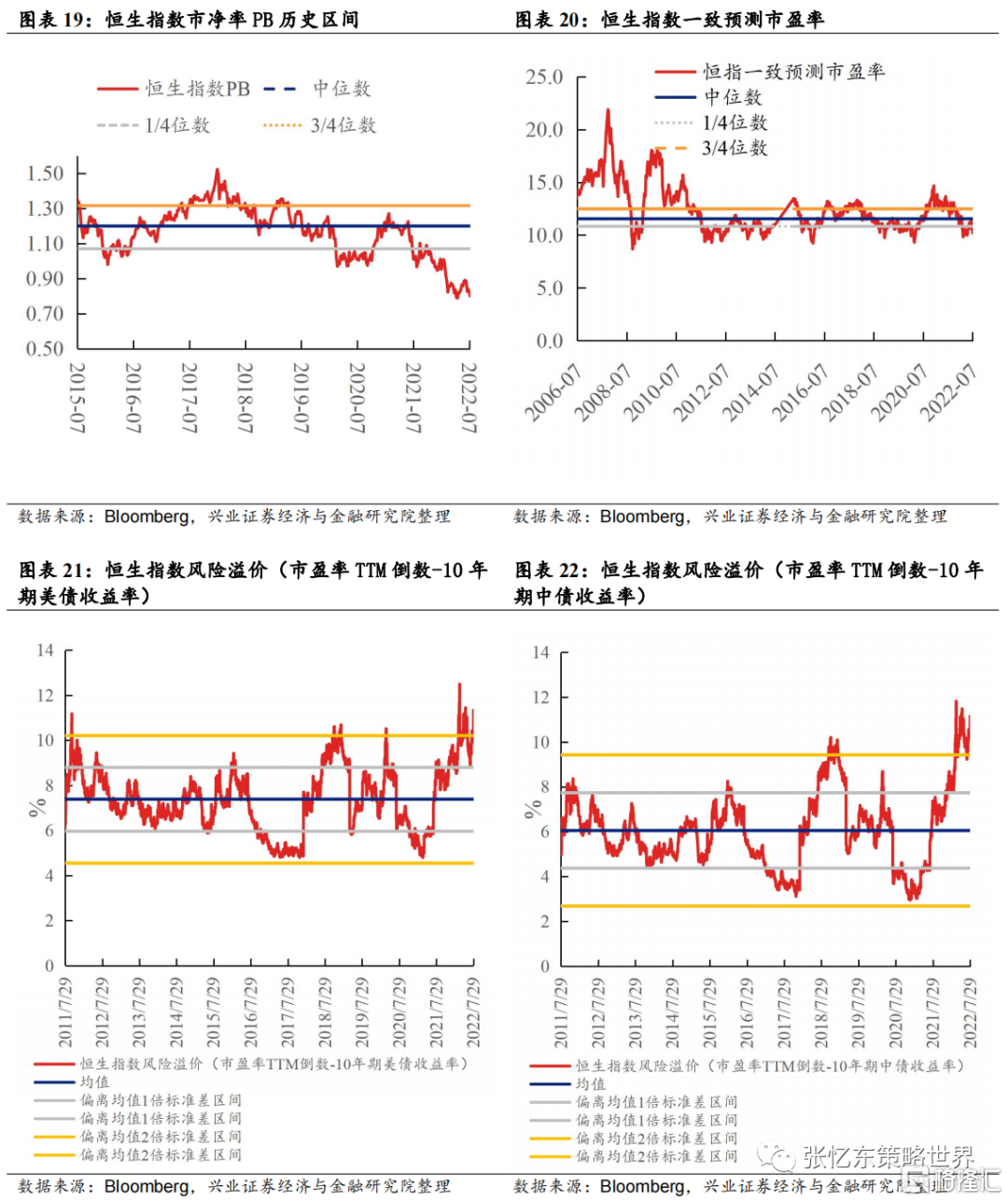 港股已充分释放了诸多宏观风险,3月中旬的底部经历了地缘政治冲突、欧美高通胀、中国疫情等“黑天鹅群”的考验。截至8月2日,恒生指数市净率水平为0.8倍;恒指预测PE(彭博一致预期)为10.2倍——位于2005年以来的15%分位数水平。截至8月12日,恒生指数风险溢价位于2011年向上偏离均值2倍标准差。