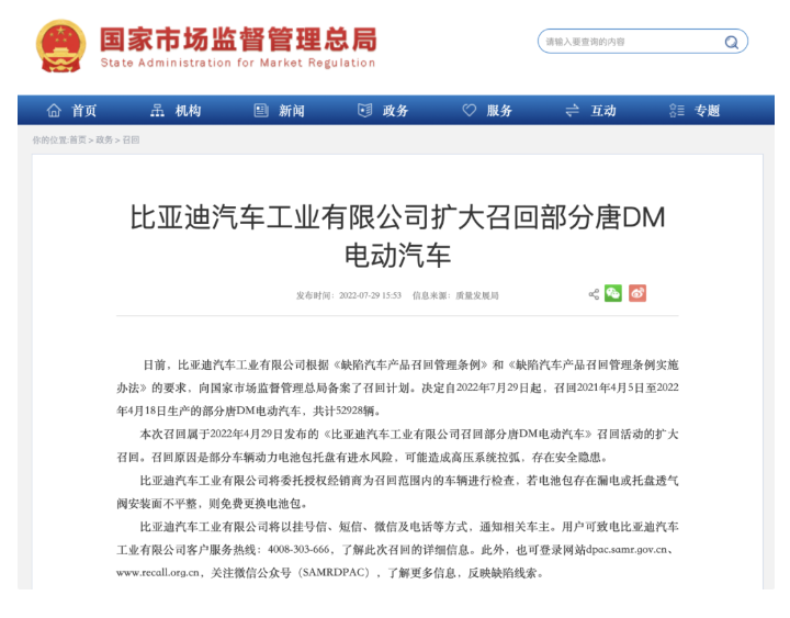 不过,最新发布的一则召回公告,也将比亚迪推入了舆论的漩涡中。据国家市场监督管理总局公告,比亚迪决定自2022年7月29日起,召回2021年4月5日至2022年4月18日生产的部分唐DM电动汽车,共计52928辆,召回原因是部分车辆动力电池包托盘有进水风险,可能造成高压系统拉弧,存在安全隐患。