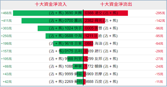 淡仓(认沽证及熊证)方面,周三美团、腾讯、快手相关淡仓单日分别获468万港元、411万港元、303万港元资金净流入,港交所、舜光等相关淡仓单日分别获295万港元、142万港元资金净流出。