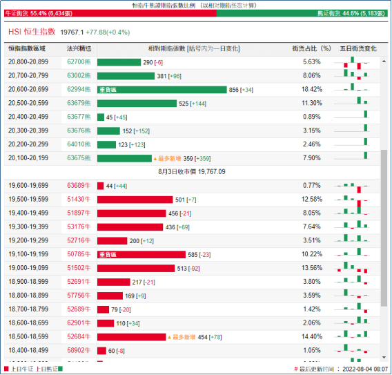 街货分布方面,至周三,恒指牛证街货重货区间主要在收回价19000点至19200点之间,累计相当约1098张期指合约;恒指熊证街货重货区主要在收回价20500点至20800点,累计相当约1762张期指合约。