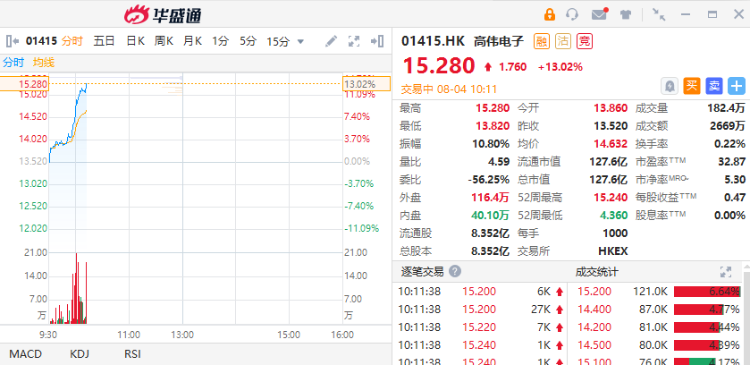 华盛资讯8月4日消息,港股苹果概念股盘中拉升,截至发稿,高伟电子涨逾13%,报15.28港元。