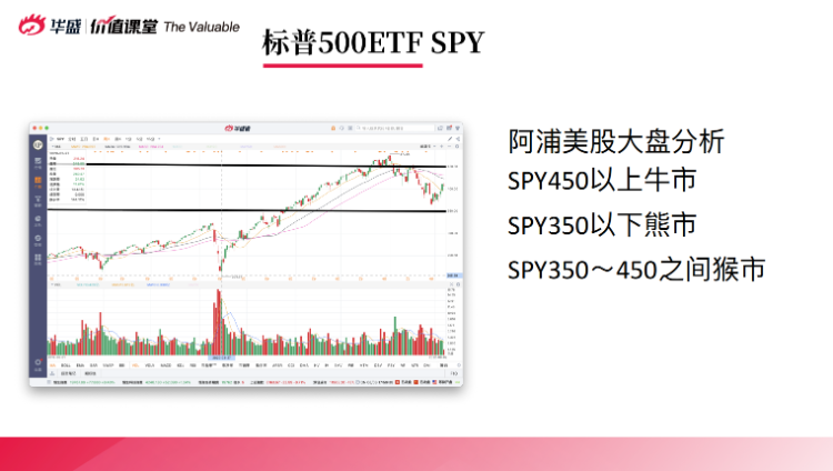 先说大致判断,整个现在的现阶段,美股的趋势用spy的表现方式来去看的话,那么如果整个大盘的SPY指数超过450点,可认为是牛市。继续跌破350以下,可认为是熊市的开始,中间100元的差值,也就是大家现在看到又回到400点以上了,可依然认为这个是一个猴市阶段。