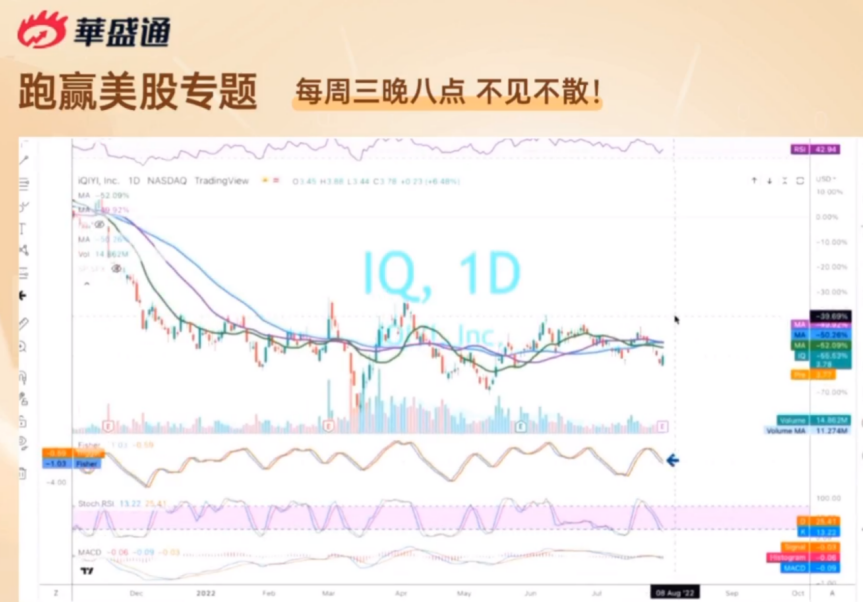 爱奇艺近两日涨逾10%,看到了所谓的复苏,那么即便是这样情况,其实放到近一年来的长期趋势里来看,目前股价仍是横盘倾斜向下的趋势,短线上周并没有给整个趋势特别大的转变,基本上是这样的一个图形。