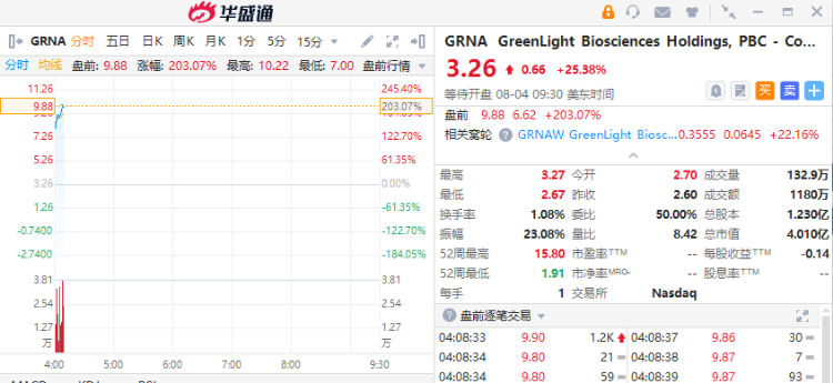 华盛资讯8月4日消息,美股盘前,三大期指走低,截至发稿,纳指期货跌0.15%,道指期货跌0.01%,标普期货指数跌0.07%。Lucid Group $LCID 盘前跌超13%,生物科技公司GRNA $GRNA 盘前涨超200%,该股隔夜收涨25.38%。每日优鲜盘前快速拉升,一度涨70%,截至发稿涨幅回落至60%,报0.1842美元。
