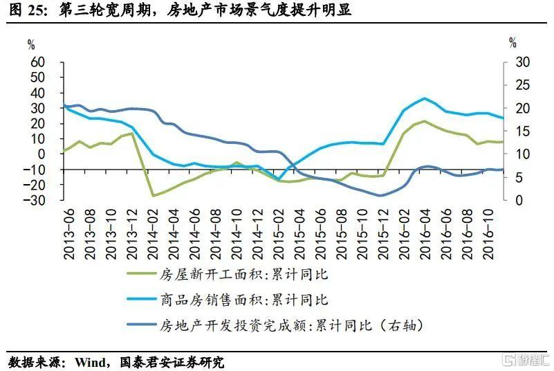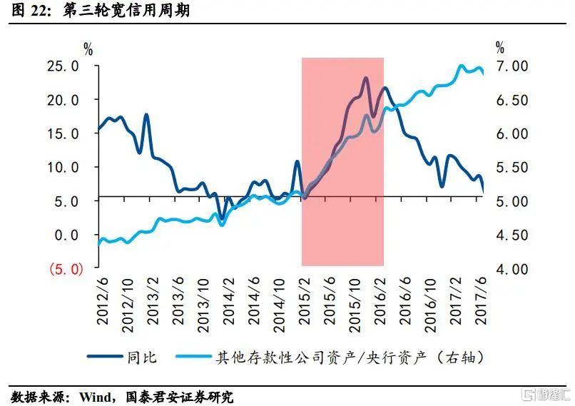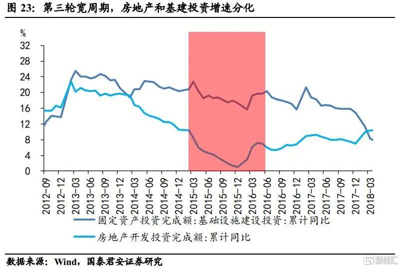 第三轮宽信用周期从2015年开始,期间受益于去库存政策,房地产开发投资增速在15年底触底反弹,但基建投资增速趋势相反,从高位逐渐走低,与地产走势相反。本轮信用周期的特点包含如下几点: