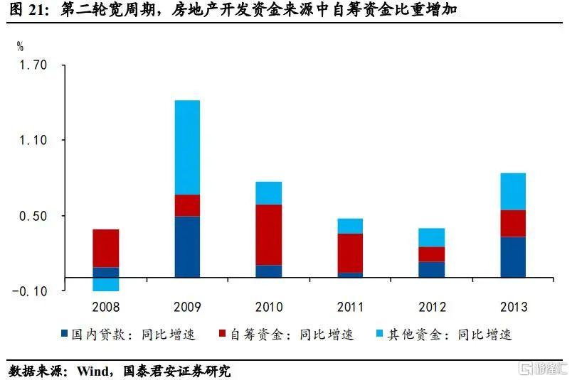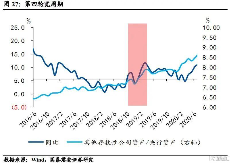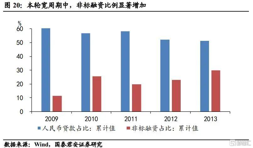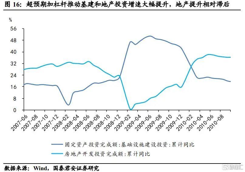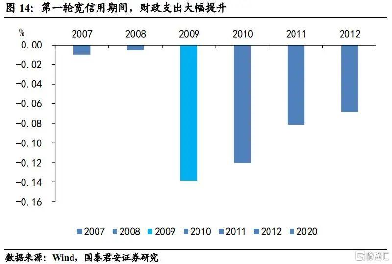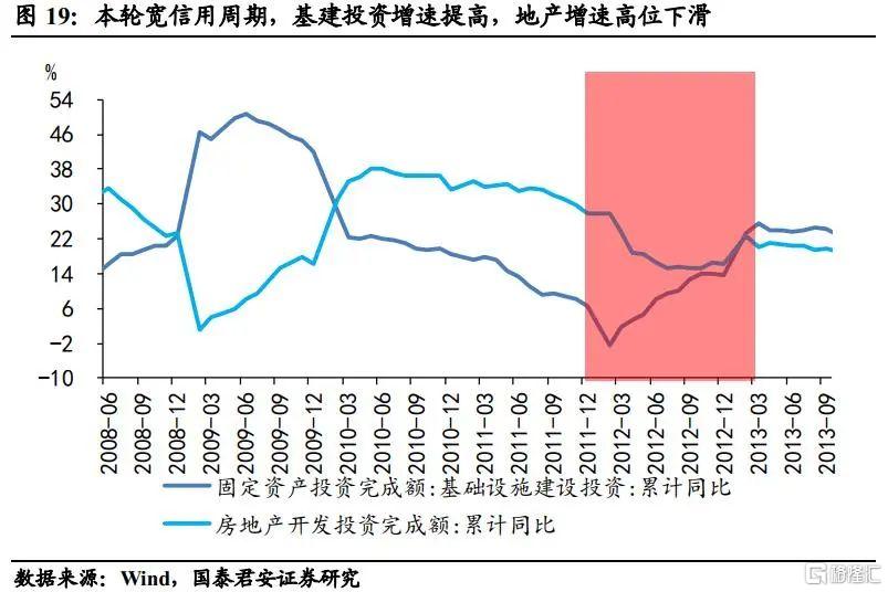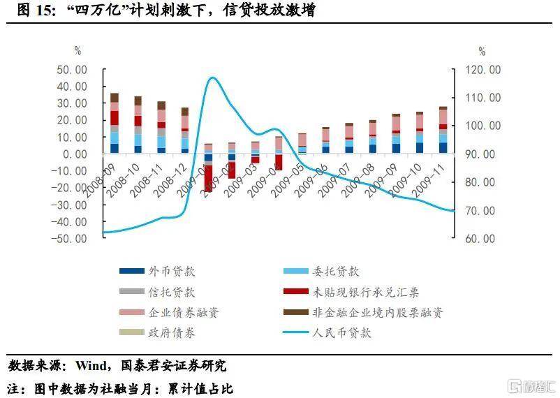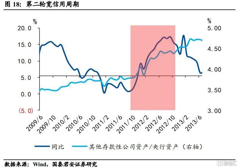 1) 第一轮(2008.11-2009.12): 货币政策传导通畅,宽信用兑现时间短,基建和地产投资激增,成为商业银行信用派生的吸收主力。