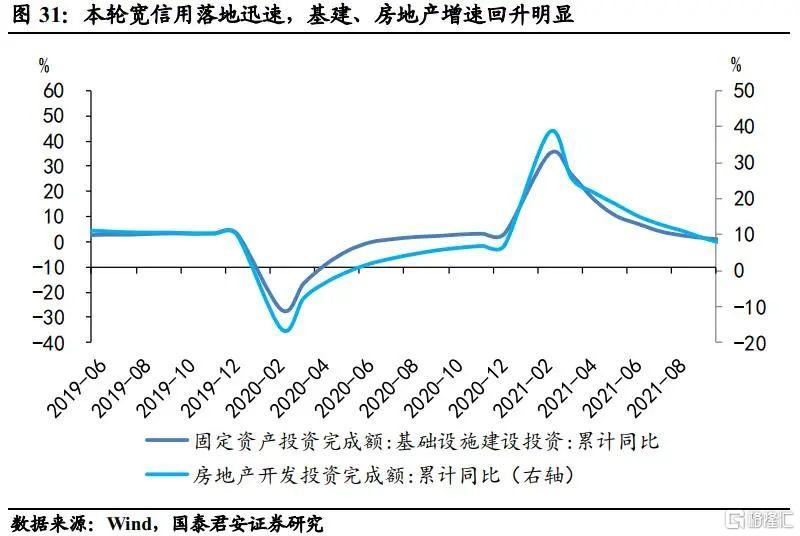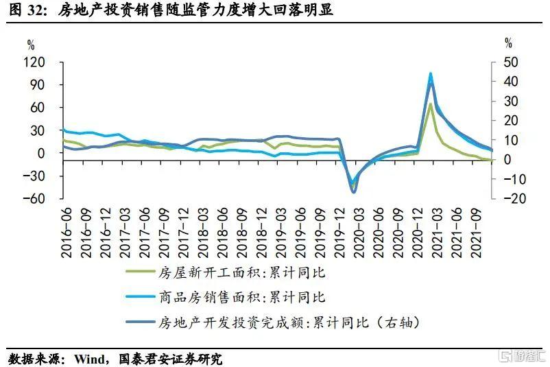 2)监管程度提升,紧信用拉车效果明显。2021年初,房地产贷款集中度监管出台,地产投资销售迅速滑落,基建投资也随城投平台隐监管加严而降速。