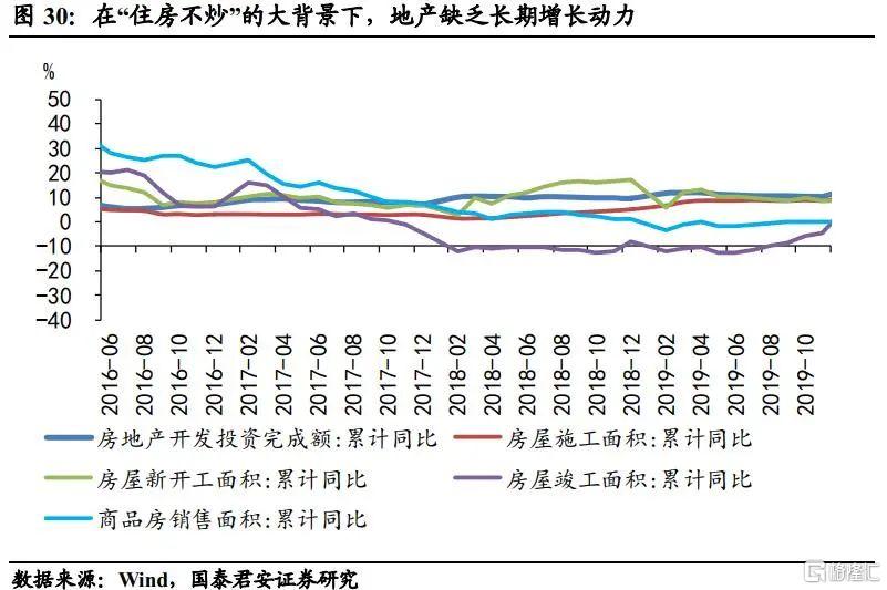 2)地产在本轮信用周期中拉动作用有限。在“住房不炒”的大背景下,地产缺乏长期增长动力。在信用环境转向前期,地产投资增速拉升,但于2019年4月又迅速回落。
