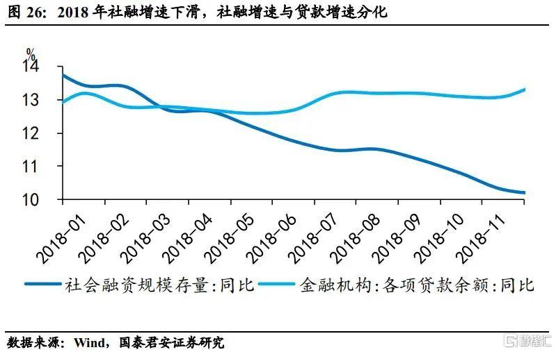 2018年,为了解决宏观杠杆率过高的问题,地方政府和企业特别是国有企业被要求尽快把杠杆降下来,努力实现宏观杠杆率稳定和逐步下降。在此背景下,金融体系信用扩张能力受到明显抑制,非标降压又进一步推动信用吃紧,2018年全年委托贷款压降1.6万亿元左右,信托贷款压降7000亿元左右,未贴现银行承兑汇票压降6300亿元左右,非标总共压降2.9万亿元左右。导致社融数据下降。这一时期社融与贷款增速分化,反映了强监管背景下影子银行业务回归表内。