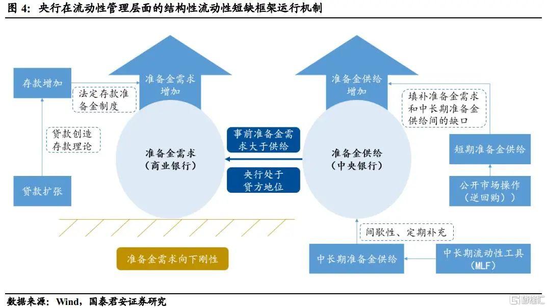 这一框架的理论基础是“贷款创造存款理论”,即信贷资产的增加,相应地将会为银行带来利润,同时也带来存款规模的增加,进而给银行在法定准备金的制度下需要缴准的资金也增加。银行举例而言,由于一般存款存在刚性增长趋势,按往年增速保守估计,2022年存款增长10%,新增存款可以达到20万亿,在对应8.1%的加权平均准备金率下,全年的缴准缺口至少达到1.62万亿。因此,可以看到,正是由于法定存款准备金制度的存在,流动性每年均有万亿级别的刚性缺口,这使得央行作为基础货币的供给方在银行间市场具有天然的资金利率“议价权”。换言之,在决定短端资金价格层面,依托法定存款准备金制度而建立的“结构性流动性短缺框架”使得央行相对于银行处于更有利的地位,进而可以调控银行信贷投放行为。