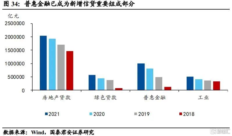 3)新型的结构性信贷工具推出,绿色贷款、普惠金融开始成为新的信用主体。在碳减排支持工具和煤炭清洁高效利用再贷款两项结构性货币政策工具的支持下,绿色贷款和普惠金融在信贷构成中地位的提升显著。其中,绿色贷款增速表现最为突出,2021年12月央行向有关金融机构发放第一批碳减排支持工具资金855亿元,支持金融机构已发放符合要求的碳减排贷款1425亿元,共2817家企业,带动减少排碳约2876万吨。普惠金融也逐步成为新增信贷的重要组成部分,2021年普惠金融全年新增贷款量为5.02万亿元,甚至超过了房地产行业全年的新增贷款3.81万亿元。这背后反映了政策高层对于普惠金融发展的重视。