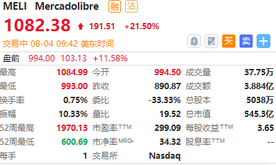 阿根廷电商MercadoLibre $MELI 盘初涨超21%,据悉该公司二季度EPS为2.43美元,分析师预期2.02美元。二季度净收入26.0亿美元,分析师预期25.0亿美元。二季度商品交易总额(GMV)为85.5亿美元,分析师预期86.3亿美元。
