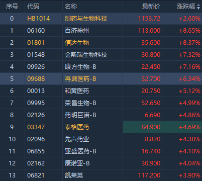 华盛资讯8月5日消息,今日开盘后港股生物科技股多数走强,信达生物盘初一度涨10%现涨8%,百济神州涨超8%,金斯瑞生物涨超7%,再鼎医药涨超6%,和黄医药涨超5%,荣昌生物涨近5%。