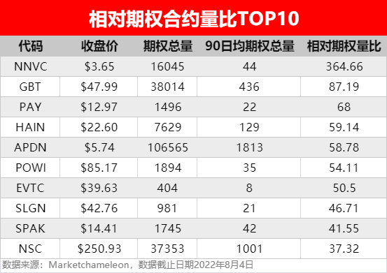 注:相对期权合约量比,是指当前交易日期权合约数量与90日平均期权合约数量的比值,相对期权量比越高,意味着该期权标的近期活跃度越高,不同于期权合约总量,该量比指标可以帮助发现一些期权数量绝对值不高,但是近期合约数量显著上升的期权标的。