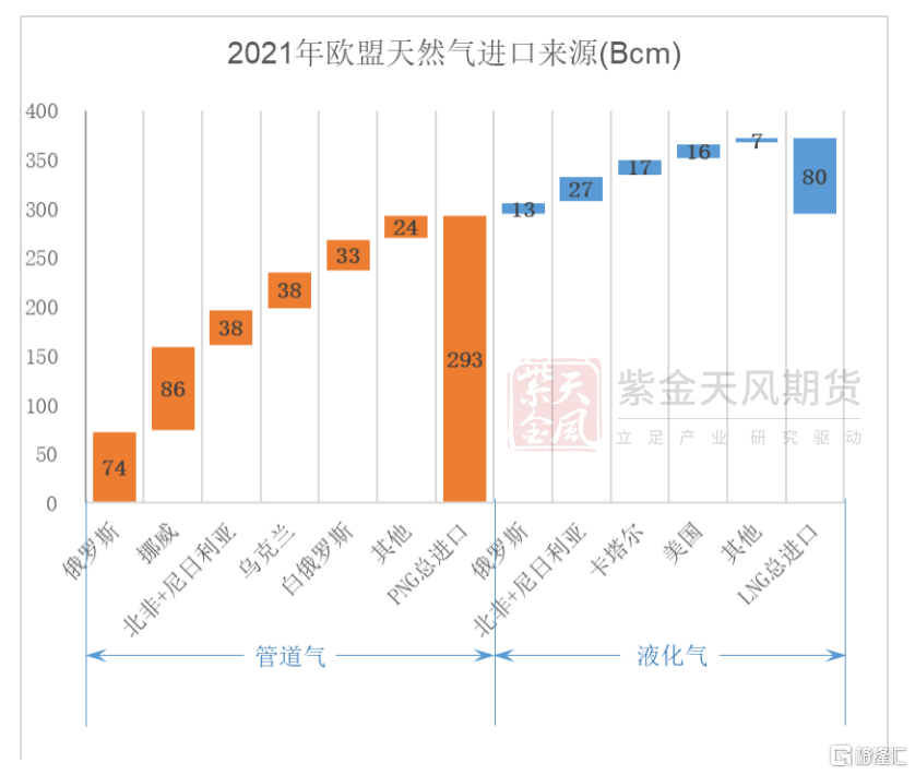2021年欧盟共进口天然气372.8Bcm,其中进口管道天然气(PNG)293.1Bcm,液体天然气(LNG)79.7Bcm。俄罗斯是最大的欧盟进口来源国,PNG和LNG共占23.3%,此外,从乌克兰和白俄罗斯进口的天然气也基本来自俄罗斯,加上这部分进口量后,欧盟至少有42.4%天然气进口来自俄罗斯。