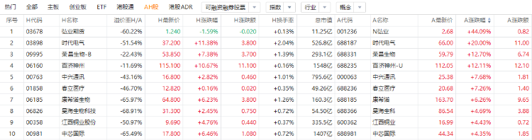 截至发稿,弘业期货A股涨44.09%,H股现跌1.59%;时代电气A股涨20.00%,H股现涨11.38%;荣昌生物A股涨12.70%,H股现涨7.38%。