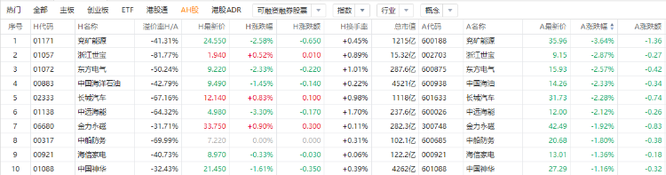 兖矿能源A股跌3.64%,H股跌2.58%;浙江世宝A股跌2.87%,H股涨0.52%;东方电气A股跌2.57%,H股跌2.33%。