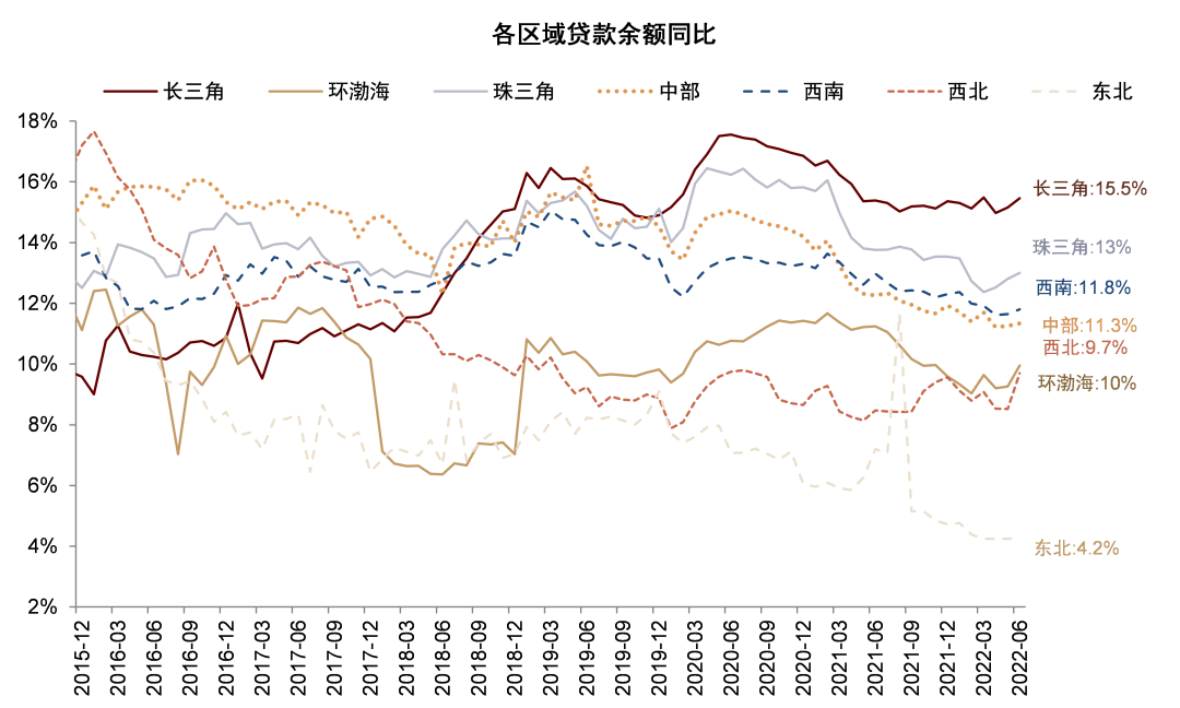 基础设施中长期贷款增速相比1Q22环比继续下滑0.7ppt,主要由于基建贷款投放滞后于“稳增长”政策发力,但增量仍然占2Q22全部贷款增量的约32%,起到信用扩张“稳大盘”作用。我们预计随着下半年政策行8000亿元调增贷款额度和3000亿元项目资本金工具到位,基建贷款增速有望企稳回升。
