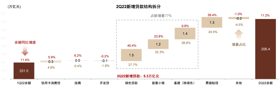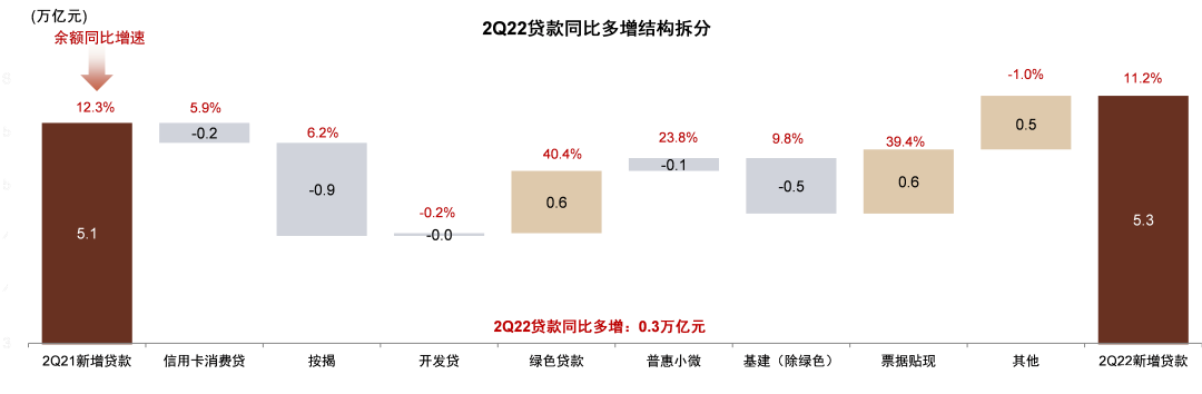 图表2:我们估算2Q22贷款同比多增的贡献主要来自于绿色贷款和票据贴现等